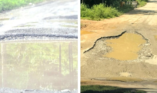 Di beberapa bagian, badan jalan bahkan sudah tidak berbentuk akibat lubang-lubang besar yang tergenang air, menyerupai kubangan kerbau.