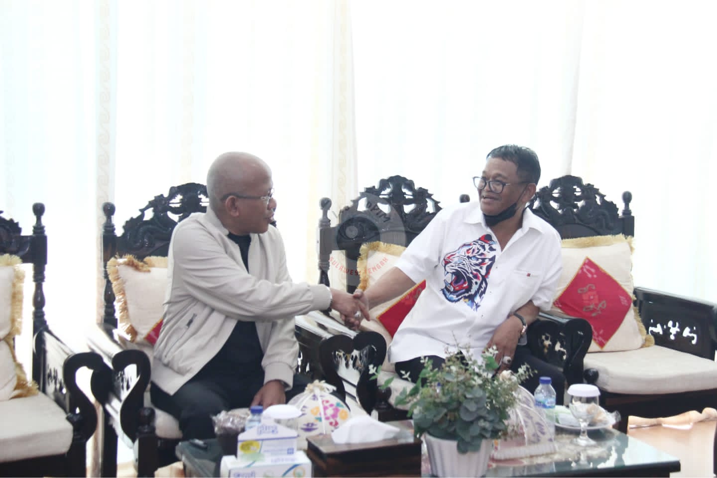 Terlihat Gubernur Rusdy didampingi Wakil Gubernur Ma’mun Amir memberikan sepotong kue ulang tahun kepada Pius Lustrilanang seraya mengucapkan selamat ulang tahun kepada Gubernur.