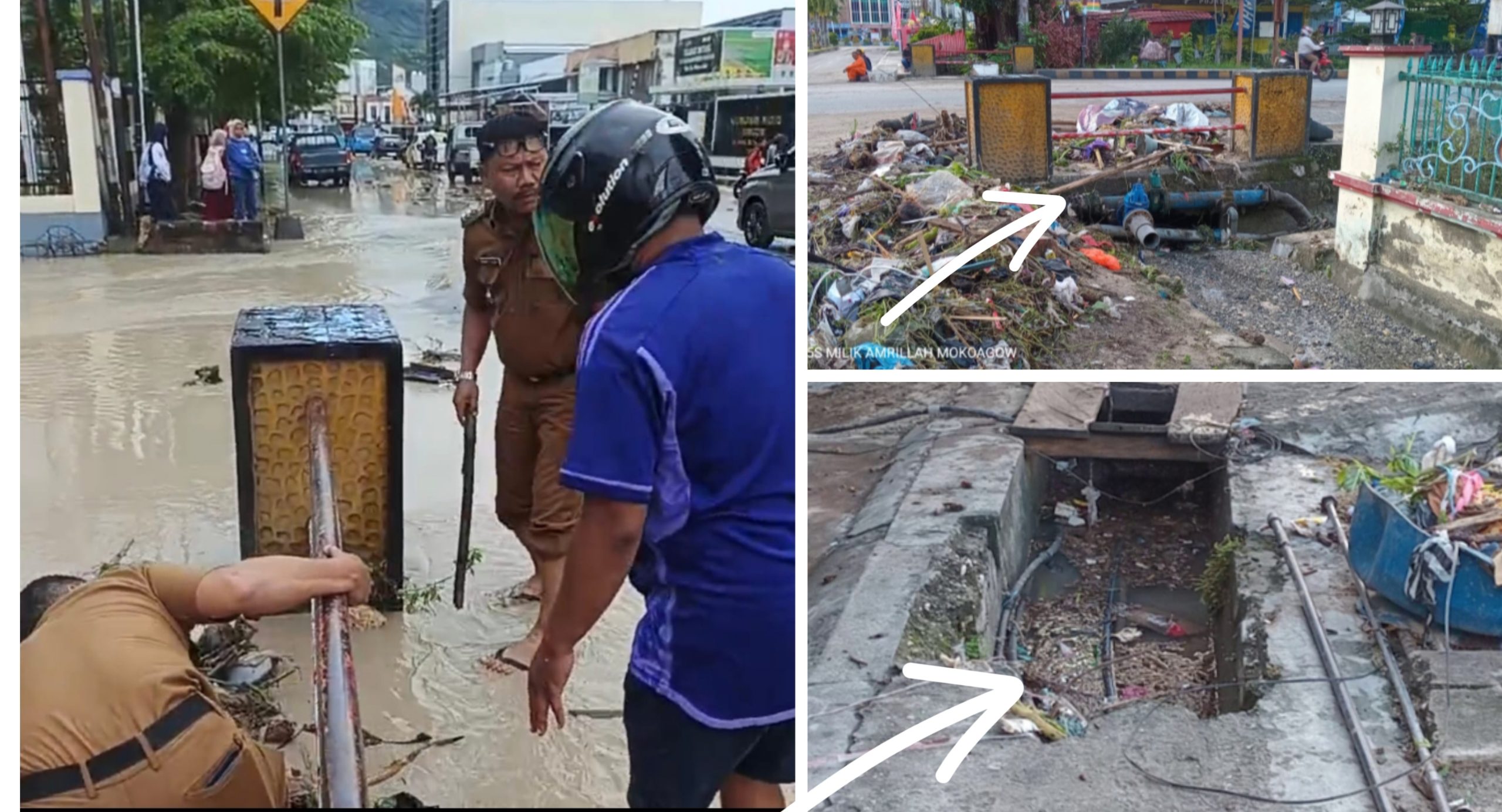 Camat Luwuk, Ridwan Polopa, bersama staf kecamatan, langsung turun ke lokasi untuk membersihkan sampah dan puing yang menyumbat saluran air akibat pipa-pipa yang dibiarkan berserakan.
