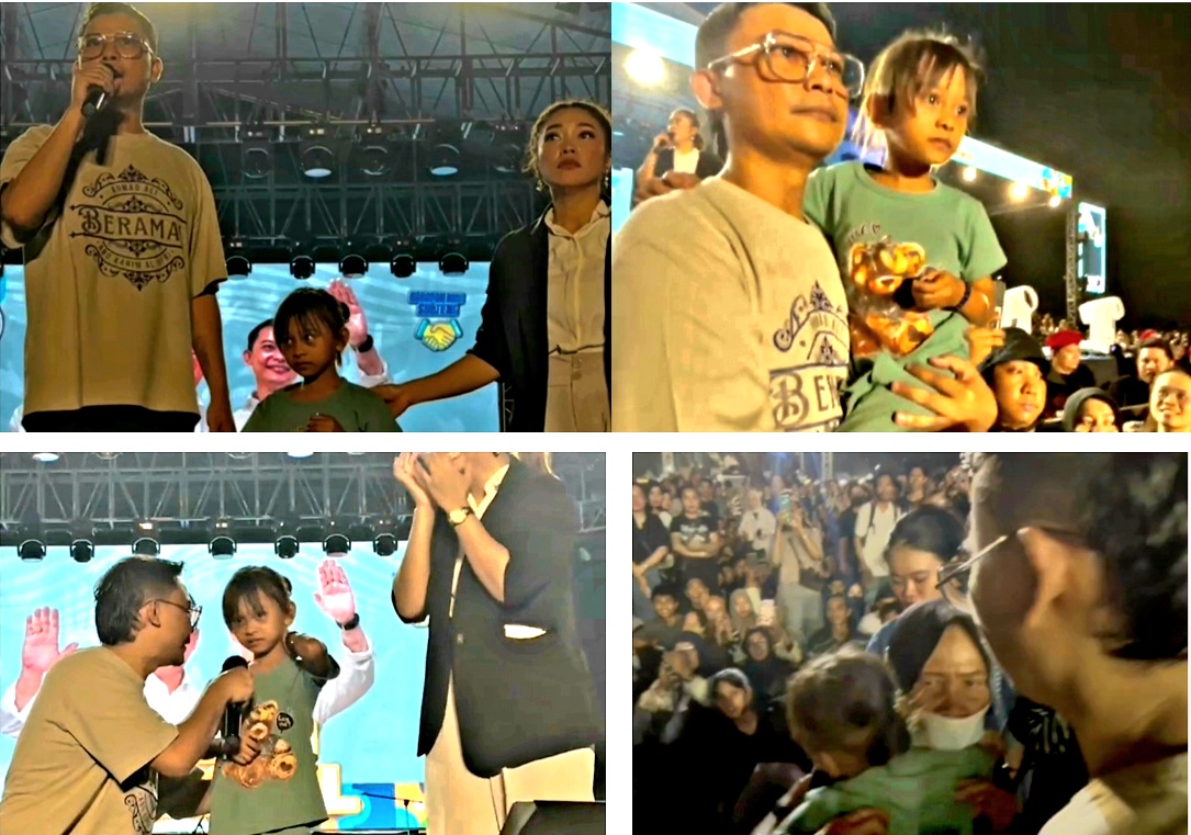 gNews.co.id – Momen Haru Abdul Karim Aljufri berdialog dengan seorang bocah perempuan yang sedang terpisah dari ibunya saat konser BerAmal di Kota Palu pada Senin (12/8/2024) malam.