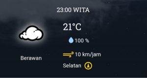 Pukul 11. Sampai 13. 00 Wita 32°C, cerah berawan. Pukul 14. 00 sampai 16. 00 Wita 34°C, cerah berawan. Lalu pukul 17. 00 sampai 19. 00 Wita 33°C, cerah berawan. Pukuk 20. 00 sampai 22. 00 Wita, cerah. Memasuki pukul 23. 00 Wita 21°C dan diprediksi berawan. BB