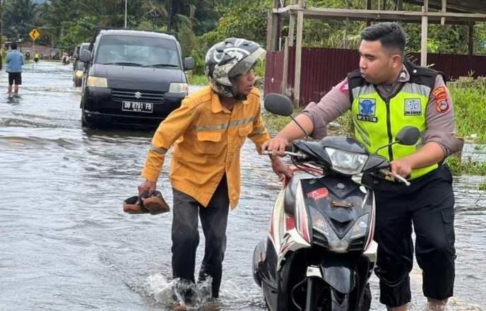 Terlihat kesigapan personel Satlantas juga saat mengevakuasi pengendara yang motornya yang harus mogok di tengah kepungan banjir karena berusaha menerobos banjir.